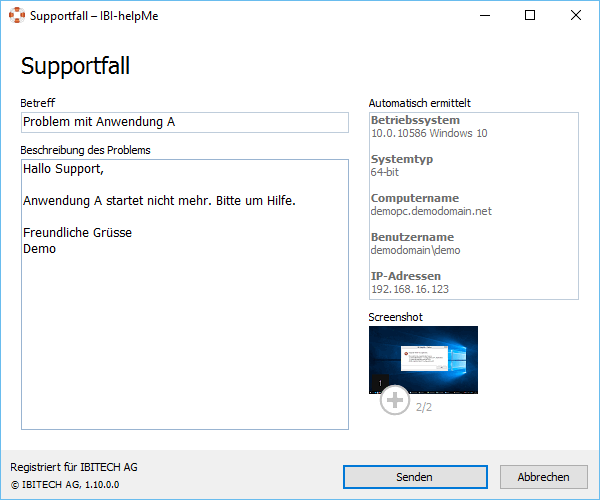 Ab Version 1.10 verwendet IBI-helpMe einen HTML-basierenden Supportfall erstellen Dialog, vorausgesetzt, der Internet Explorer 11 ist installiert. Andernfalls wird als "Fallback" der Standard-Dialog verwendet.