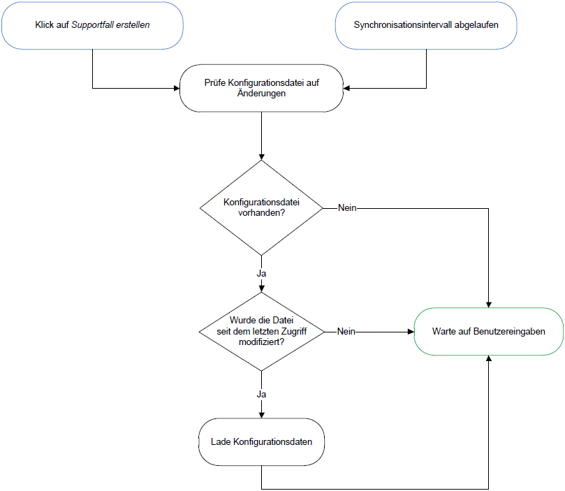 Während des Betriebs prüft die IBI-helpMe Client-Anwendung in regelmäßigen Zeitabständen, ob Änderungen an der Konfigurationsdatei vorgenommen wurden. Wurde die Konfigurationsdatei seit dem letzten Zugriff verändert, werden die Informationen ausgelesen und entsprechend umgesetzt. Die Prüfung der Konfigurationsdatei wird auch vor dem Erstellen eines Supportfalls durchgeführt, sodass die aktuellen Einstellungen möglichst schnell angewendet werden.