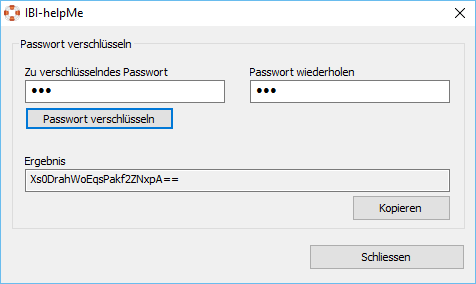 To prevent a third party from reading a login password in the configuration file, an encrypted password is stored. The option to encrypt a password is built into the IBI-helpMe Client application. For this, the application must be started using the /Admin parameter. The chosen password can then be encrypted in the window that appears. The generated password then needs to be inserted into the corresponding field of the configuration file.