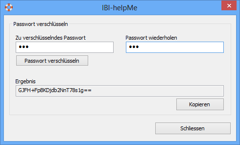 Um zu verhindern, dass ein Login-Passwort in der Konfigurationsdatei von Dritten ausgelesen werden kann, wird das Passwort verschlüsselt abgelegt. Die Möglichkeit ein Passwort zu verschlüsseln ist in der IBI-helpMe Client-Anwendung integriert. Hierzu muss die Anwendung mittels des Parameters /Admin gestartet werden. Im erscheinenden Fenster kann nun das gewählte Passwort verschlüsselt werden. Anschließend muss das generierte Passwort in das entsprechende Feld der Konfigurationsdatei eingefügt werden.
