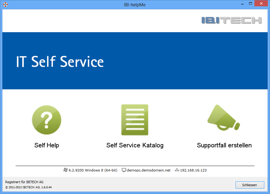 Die IBI-helpMe Client-Anwendung kann als Einstiegspunkt zu einem Service Portal genutzt werden. Dabei wird eine individuell gestaltete HTML-Seite anstelle des üblichen Dialogs zur Erstellung eines Supportfalls angezeigt. Das Erstellen eines Supportfalls über den klassischen Supportfall erstellen-Dialog kann dabei weiterhin, falls gewünscht, über das Kontextmenü des Taskleistensymbols erreicht werden oder komplett deaktiviert werden.