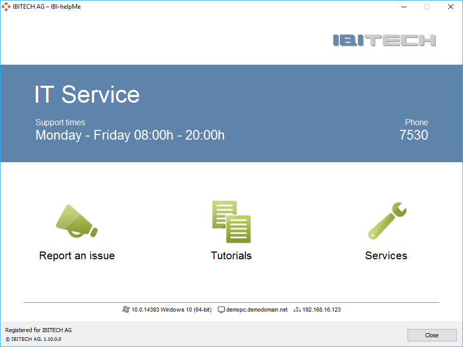 The IBI-helpMe Client application can be used as an entry point to a Service Portal. In this case, an individually designed HTML page is displayed instead of the usual dialog for creating a Support Case. Creating a Support Case via the classic Create Support Case dialog is still accessible through the context menu of the taskbar icon, if desired, or can be completely disabled.